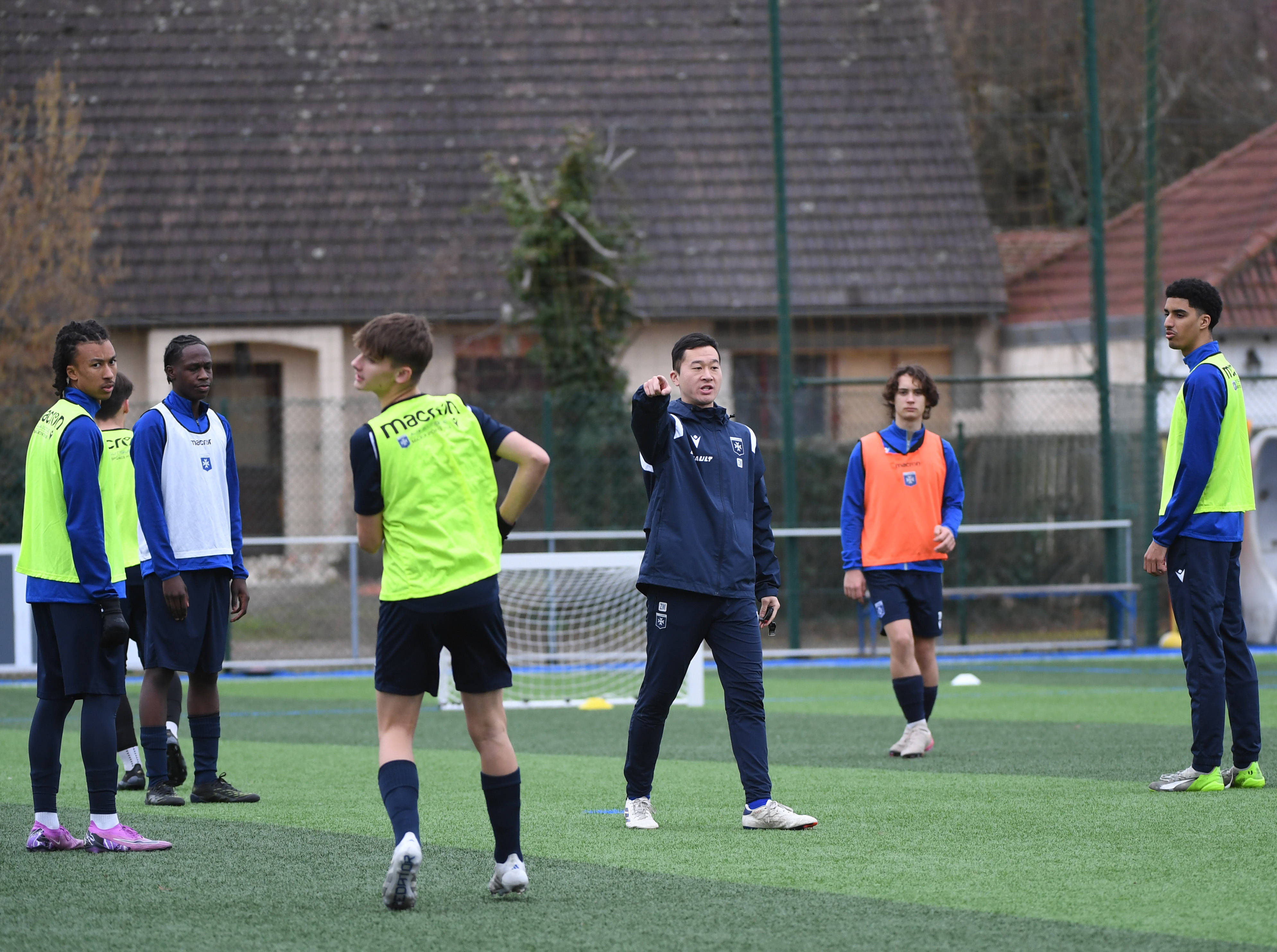 1月14日,在法国欧塞尔,欧塞尔俱乐部中国籍教练明智(右三)在指挥U18梯队训练。新华社记者 贺灿铃 摄饶勒斯对中国犀旺队球员的比赛能力和训练状态给予了很高评价。“这支队伍很有特点,比赛节奏很快,在前几天的比赛(常规时间)中逼平了强大的巴黎圣日耳曼U19队。他们的训练量很大,但球员们训练时非常投入,这也给了欧塞尔的青训球员们一个很好的示范,即在那么高的强度下仍能非常刻苦地完成训练,从中可以学习中国球员的认真精神。”