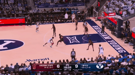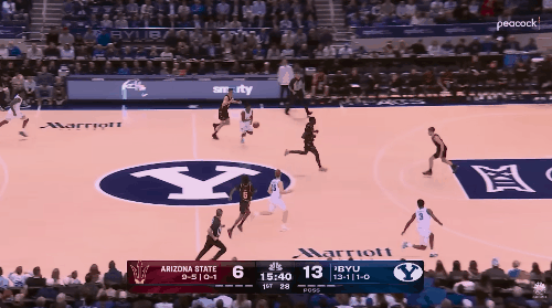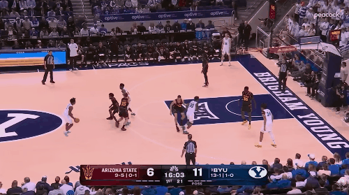 而需要明确的是,迪班萨在组织进攻方面也还有成长空间。在对阵犹他大学时,他大多只是做出简单的阅读,在补防和逼抢到来之前及时分球。虽然这些决策都是正确的,但也谈不上是通过预判来提前破坏防守策略所导致的。在杨百翰,他已经可以做到在防守轮转到位前找到空位队友,从而击破包夹防守,但仍然会有盲目转身冲入人群导致处理球空间狭小的情况;在大学,他尚且能凭借自身的纯粹天赋从人堆里杀出血路,但到了NBA后,这些都会成为詹姆斯都救不回去的失误。