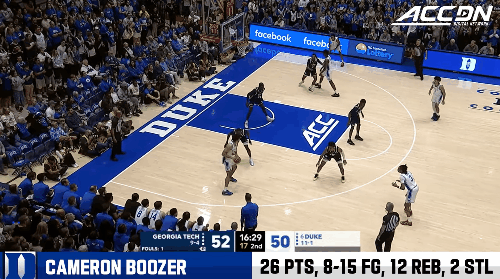 杜克大学蓝魔队正努力弥补去年闯入最终四强后,几位球星离队所带来的损失,其中就包括在2025年NBA选秀中以状元秀身份被选走的库珀·弗拉格。而今年,卡梅伦·布泽尔的到来无疑正帮助球队填补这一空缺。当下,他场均可得到23.7分9.9篮板4.1助攻1.9抢断0.6盖帽2.2失误1.6犯规,场均得分位列全NCAA第一,篮板位列ACC联盟第三,场均助攻数则是ACC联盟第11,可以说是无可指责的全能战士;而他的BPM已经来到了20.4,位列全美第一。更别提他本赛季已四次单场得分至少30分,继1月17日对阵斯坦福大学得到30分后,他已连续两场比赛得分30+。而杜克大学本赛季的总战绩也已经悄然提升至18胜1负。目前,他们已取得七连胜,并继续领跑ACC联盟积分榜。