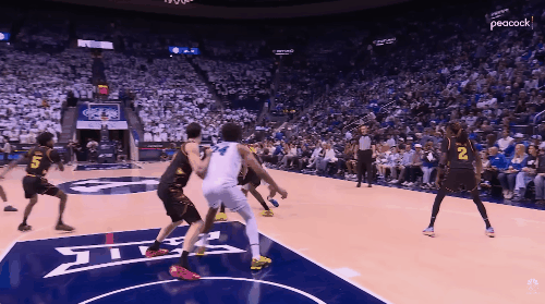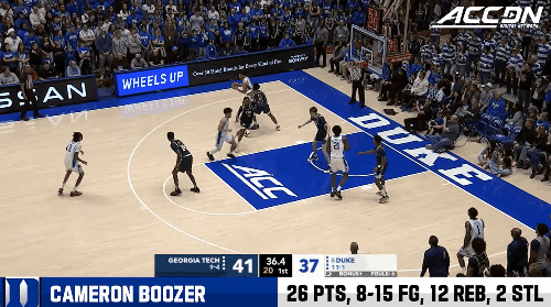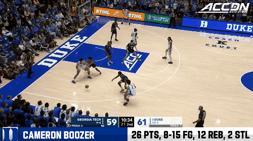 杜克可能拥有全国最好的传球内线搭档,其中卡梅伦·布泽尔的视野和组织肉眼可见的出色。他持续做着自己最擅长的事:带领一支主要由低年级学生组成的杜克大学赢得胜利。他全面的产出、沉着冷静的竞争天性以及对团队篮球的理解,使其成为杜克最全面的进攻球员,无论担任什么职责都能立即带来提升。作为持球手,他和以赛亚·埃文斯的掩护配合能够在吃下后者投射辐射的同时顺利突破篮下;而他的突破得分表现也很强,这得益于他高于平均水准的控球技术、灵活的脚步,强壮的体格以及优秀的身体协调性,无需依赖爆发力就可以在篮下造杀伤。而在外线,这位大个子在非持球投篮方面也已经展现出优秀的潜力。截至1月27日,他的三分77投29中,命中率达到了37.7%,甚至比AJ·迪班萨还多10个。此外,他还是杜克大学的助攻王,场均能送出4.1次助攻,一己之力便可盘活整个球队。
