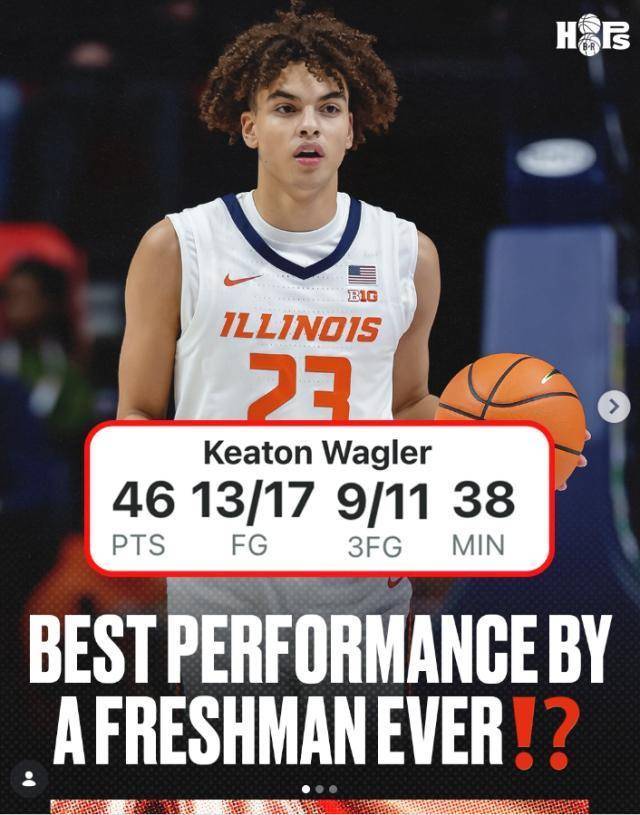•伊利诺伊大学新生基顿·瓦格勒(高四时,他在247体育榜中勉强杀入Top150,仅伊利诺伊大学给了他High·Major的offer)在麦基竞技场对阵普渡大学的胜利中狂轰46分,创下该场馆对手球员最高得分纪录。而该场比赛中,伊利诺伊大学全场得到88分,并且把普渡大学限制到82分。可以说,瓦格勒一己之力就得到了球队一半多的分数。
