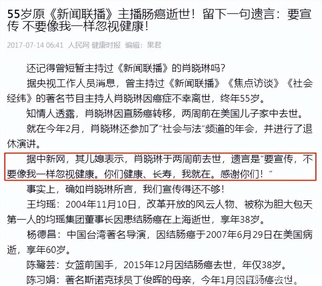 在肖晓琳处于职业巅峰时期时,她持续熬夜,饮食也不规律,身体早已发出预警,结直肠癌的检测结果便成为最直观的“裁决”。她的健康状况不断地被透支,已至无法挽回的程度,直到2017年7月,她正式离职五个月之后,才迎来这一沉重的打击。