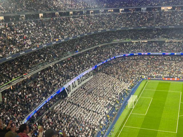 对皇马球迷来说,本场两个话题性人物普雷斯蒂安尼和穆里尼奥双双缺席,多少让他们少了些发泄的出口。伯纳乌南看台赛前打出“反对种族主义”的标语,虽是为了支持维尼修斯而打出,但在自家球员怀森社媒转发涉及歧视不当内容的这个节骨眼上看来,这条标语多少显得有些讽刺了。